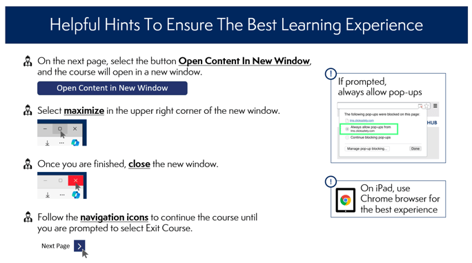We've updated course settings to improve the learner experience when launching courses that open additional windows. This update also improves completion reporting for select courses that were experiencing issues. As always, allow pop-ups if prompted and if using an iPad to view content, log into your learner account from the Chrome browser.