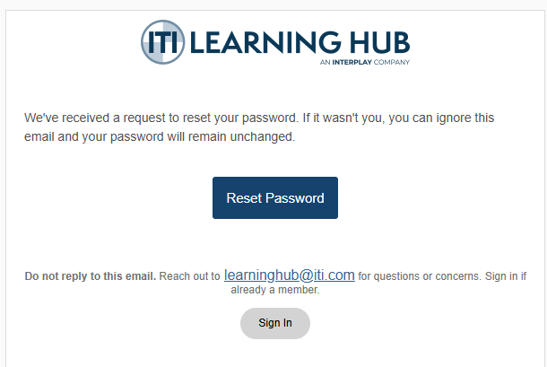 - Reset Password from the Login Screen: Simply navigate to the login screen of the Learning Hub and select the "reset password" option. You will then receive an email containing instructions to access the password reset screen. Follow the prompts provided in the email to complete the password reset process. Go here: https://learn.iti.com/learn/sign_in