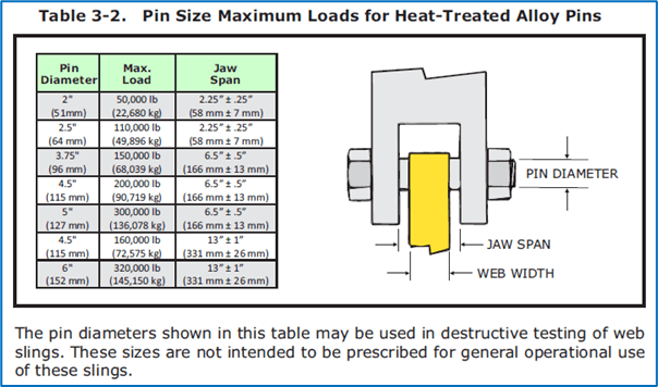 - The minimum test pin diameter as recommended by the Web Sling & Tiedown Association Recommended Standard Specification* documents for either web slings or roundslings should be adhered to (see Table 3.2).