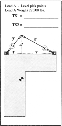 A phenomenon occurs in rigging when we are faced with hoisting a load which has its pick points on two different elevations. We cannot use the simplified system described above but must use the long-hand method to determine sling tensions. If we attempt to use the simplified method to find sling tension in off-elevation picks, we discover that the lower elevation pic point and its sling are realizing more tension than anticipated. We can mistakenly overload the rigging gear if we do not predetermine the actual tensions to each sling leg.