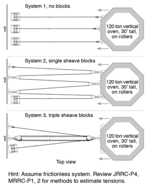 Information: All winches have a maximum capacity of 2 tons. All single sheave rigging blocks are rated at 3 ton WLL, and triple sheave rigging blocks are rated at 10 ton WLL. All load and wall anchor pulling lugs are rated at 8 ton WLL each. All shackles are rated at 12 tons each.