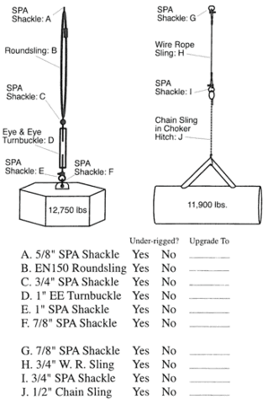 Identify the rigging that does not have sufficient rated capacity for the load. If under-rigged, suggest the proper size.