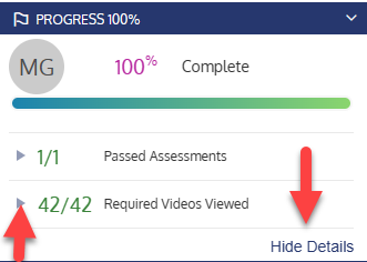Regarding your inquiry, I'd like to provide some insight into the progress tracking features within our course content. In most cases, you'll find a progress bar conveniently located on the left navigation panel within the course interface. By clicking on the details link, you can gain a comprehensive overview of the specific elements contributing to your current status.